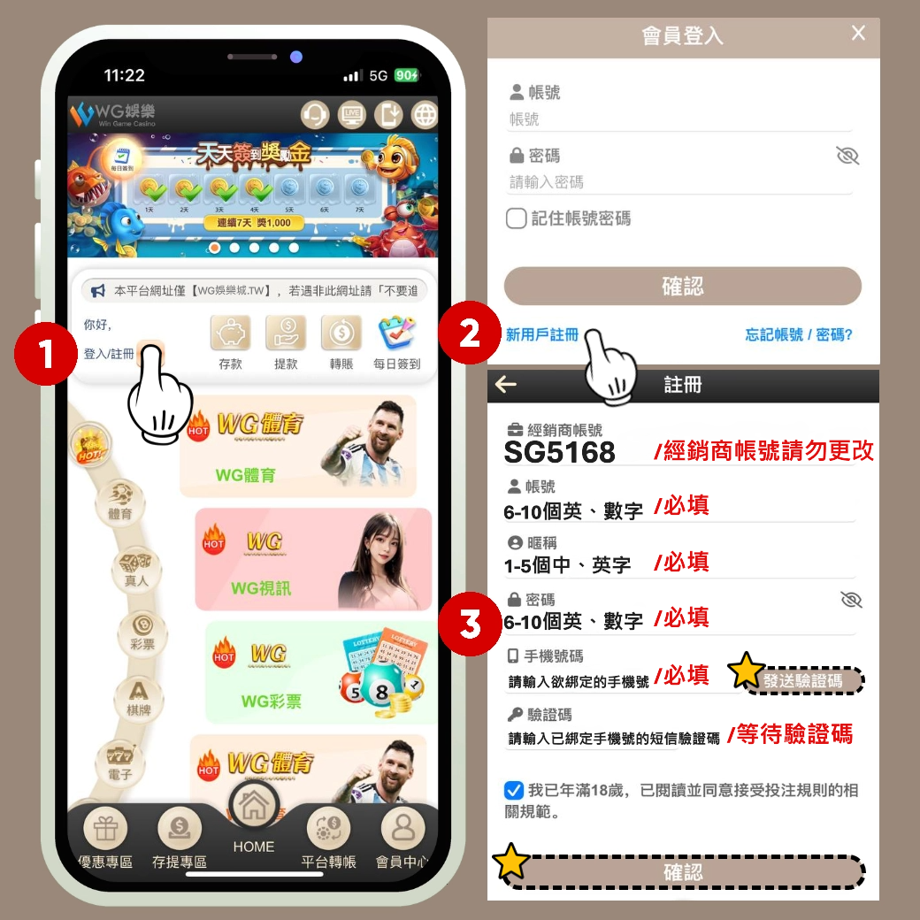 WG娛樂城註冊說明,請依序填寫,經銷商帳號:SG5168已自動帶入,不須修改。